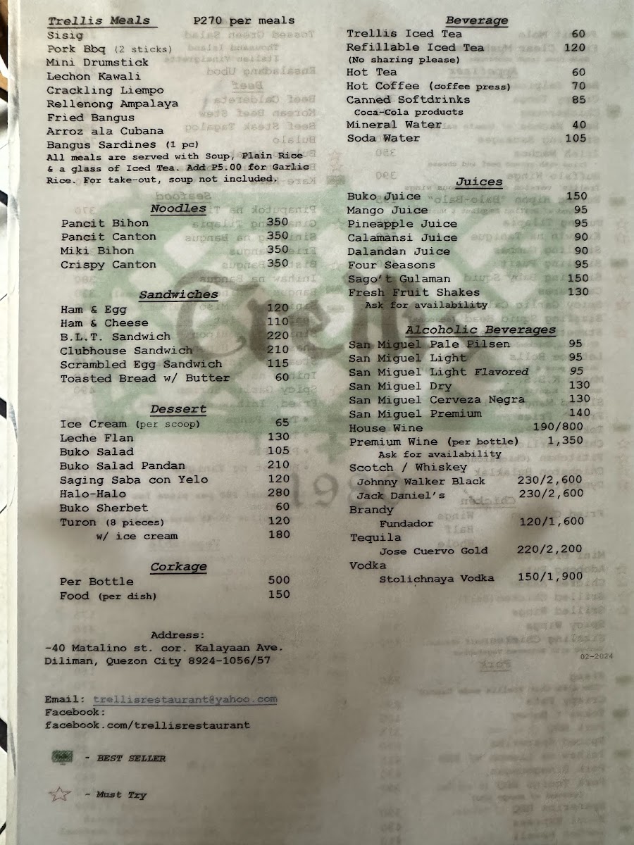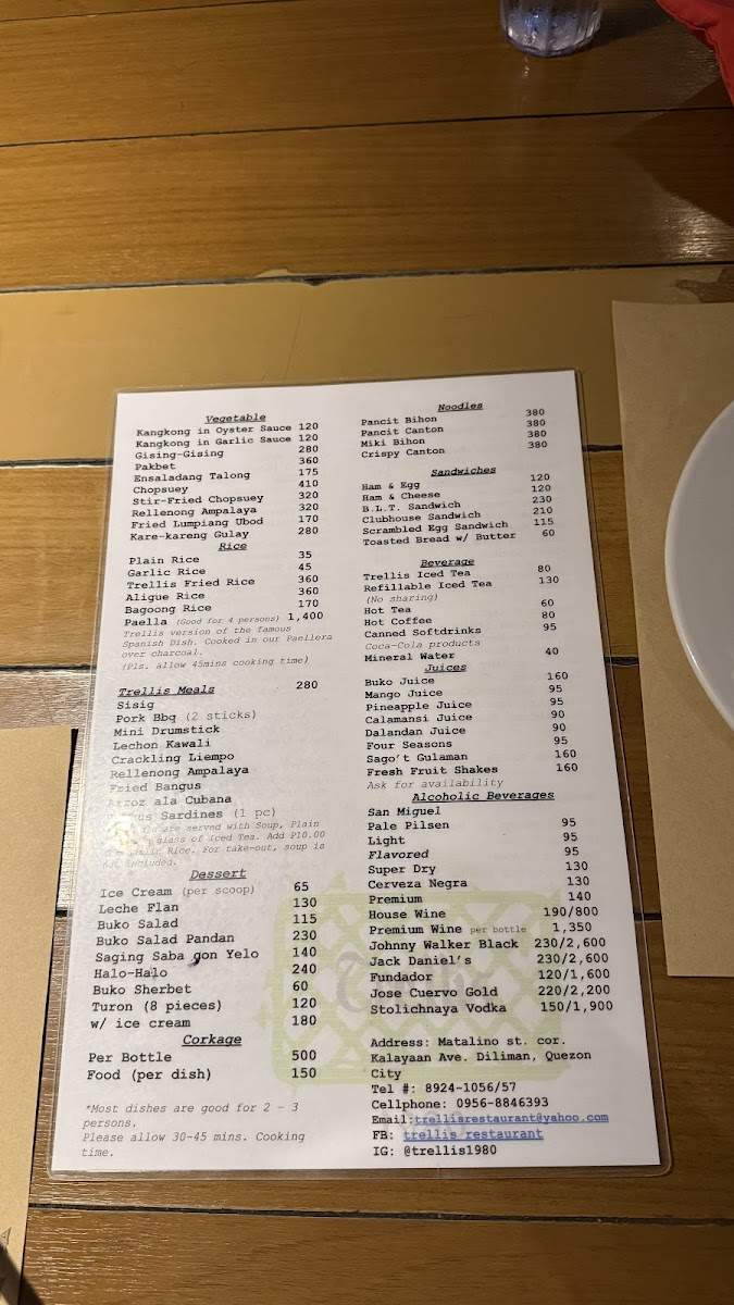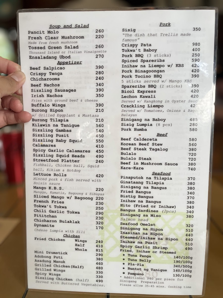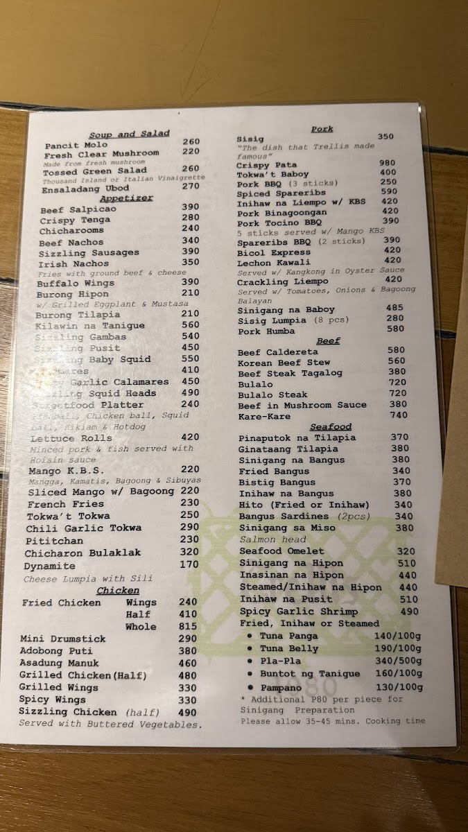 The menu at Trellis offers a straightforward selection of comforting Filipino dishes that feel both familiar and satisfying. With a focus on classic urban favorites served bar-style, it provides casual bites that pair naturally with cold beers and relaxed conversation.